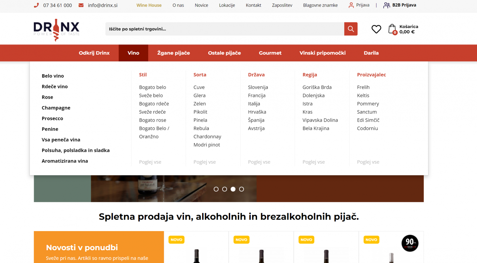 Primeri "mega menija" za predstavitev prodajnega programa pijač glede na vrsto in podskupine/vrste (vin glede na sorto) drinx.si: